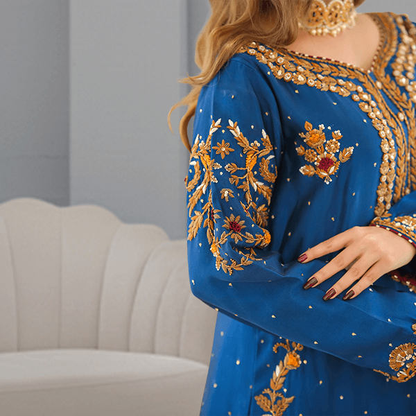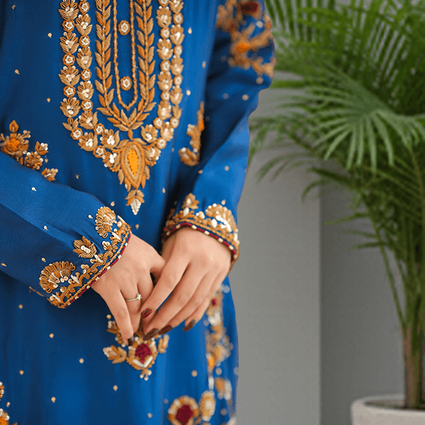 The short embroidered kurti is beautifully complemented by a lining and gharara featuring a stunning modern print, which Read More